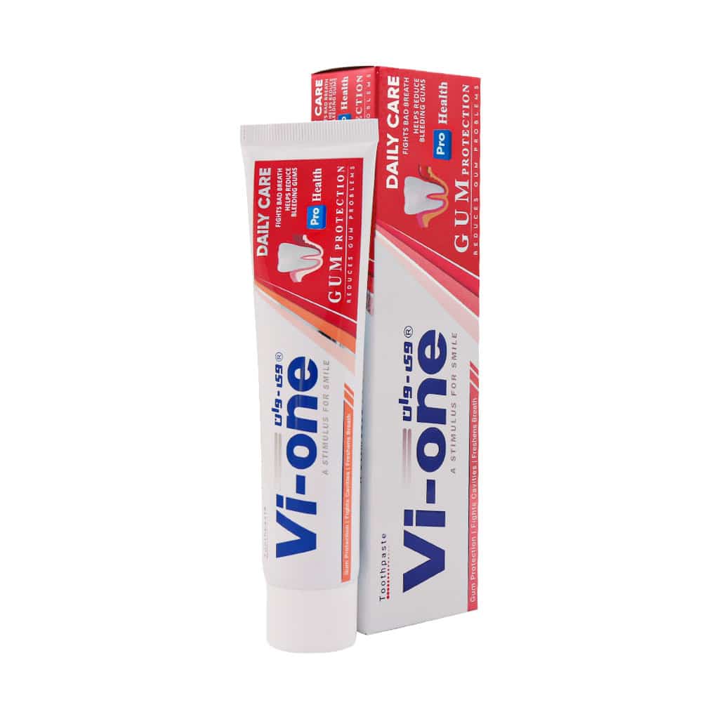خمیر دندان محافظ لثه وی وان فواید بسیاری برای دهان، دندان و لثه شما دارد. استفاده از این خمیر دندان موجب میشود تا التهابات لثه کاهش یافته و یا از بروز التهاب جلوگیری به عمل آید. علاوه بر این مورد، خمیر دندان Vi One سفید کننده دندان بوده، خوشبو کننده دهان است و از تشکیل جرم و پوسیدگی دندانها نیز پیشگیری میکند. خمیر دندان محافظ لثه Vi One را میتوان هم برای بزرگسالان و هم برای کودکان استفاده کرد اما باید به این نکته توجه داشته باشید که اگر قصد دارید برای کودک زیر 6 سال خود از این خمیردندان جهت پاکیزگی و بهداشت دندانها استفاده کنید، فقط به اندازه یک نخود از این محصول را روی مسواک کودک بگذارید تا با آن مسواک بزند. در رابطه با استفاده از خمیر دندانها این نکته را نیز مد نظر بگیرید که به منظور نتیجهگیری مطلوب، بهتر است حداقل 2 دقیقه با خمیردندان، مسواک بزنید و از مسواک زدن سریع بپرهیزید.
