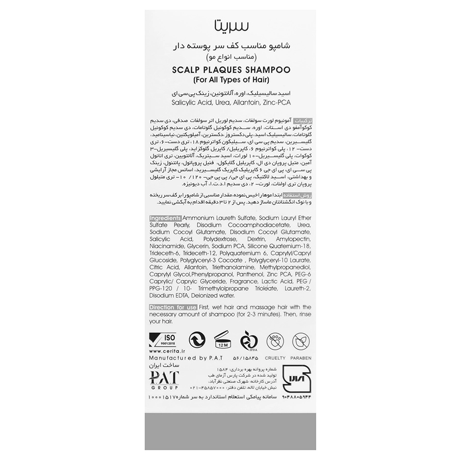 - شامپو سریتا پسوریازیس، پاکسازی پوستههای اضافی و بهبود پلاکهای خشک