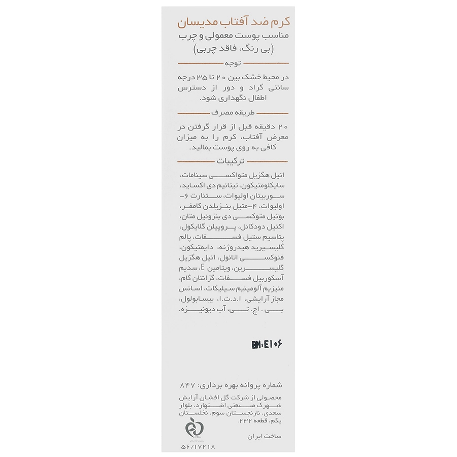 لیست ترکیبات کرم ضد آفتاب بی رنگ SPF50 پوست معمولی و چرب مدیسان
