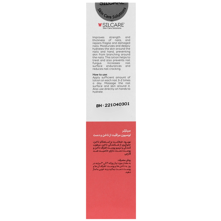 لوسیون ناخن Silcare با بهره گیری از ترکیبات خود می تواند اثر رطوبت رسانی قابل توجهی برای پوست اطراف ناخن به همراه داشته باشد و نیز موجب ترمیم، نرم شدن و پیشگیری از خشکی و پوسته ریزی این ناحیه گردد. لوسیون ناخن سیلکر که برخی آن را به عنوان کرم ناخن سیلکر می شناسند، در پیشگیری و درمان بیماری های قارچی ناخن نیز بسیار مؤثر عمل می کند. با مصرف لوسیون مراقبت ناخن سیلکر ظاهری زیبا برای ناخن های خود به ارمغان آورید.
