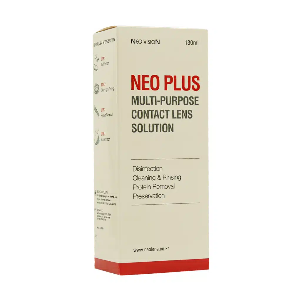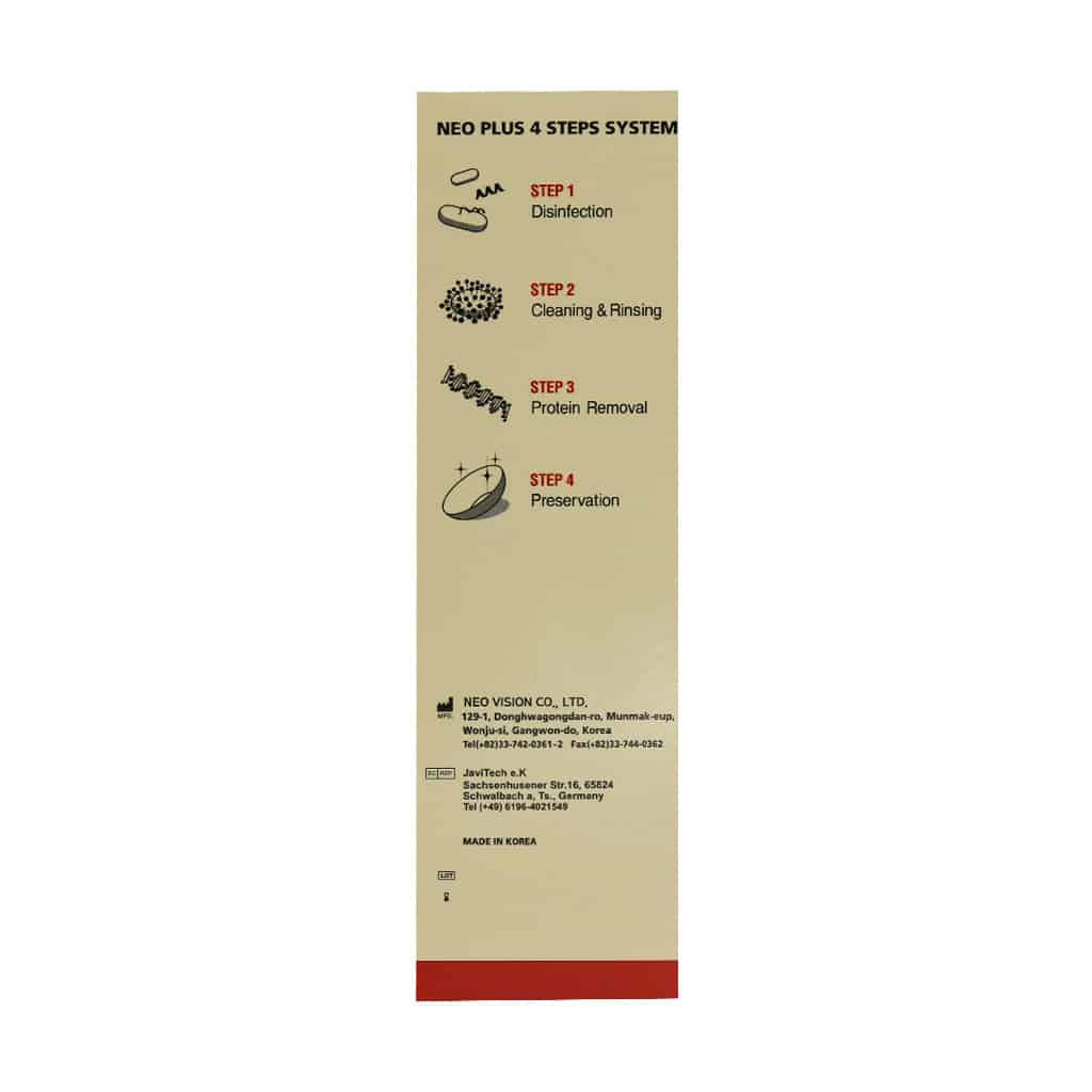 هر طرف لنز را حدودا ۲۰ ثانیه با ۳ تا ۵ قطره محلول شستشو دهید. لنز را با محلول آبکشی کنید. لنز را حداقل ۴ ساعت در جا لنزی پر از محلول قرار دهید و در آن را محکم ببندید. درصورتیکه در جا لنزی به خوبی بستهشده باشد، لنز میتواند حداکثر ۳۰ روز در محلول بماند. قبل از استفاده مجدد از لنز، مجدداً آن را با محلول نئو پلاس آبکشی کنید.