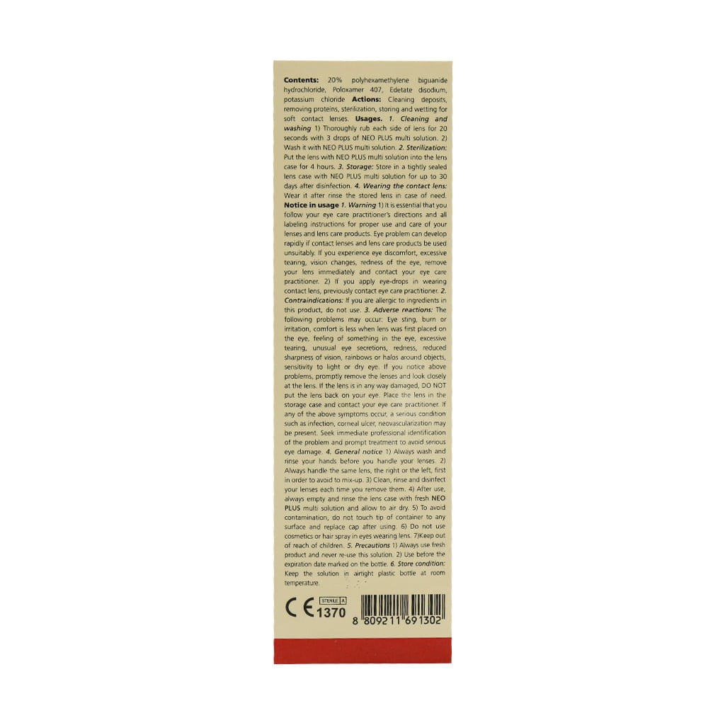 محلول شستشوی لنز نئو پلاس برای انواع لنزهای طبی و زیبایی مناسب است و سلامت لنز و چشم شما را تضمین مینماید. این محلول دارای یک جالنزی با خاصیت آنتیباکتریال است که پروتئین و آلودگیهای سطح لنز را از بین میبرد.