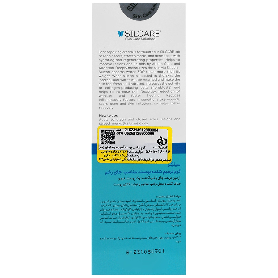 روزانه 2 الی 3 مرتبه از کرم ترمیم کننده سیلکر بر روی زخم بدون ترشح بمالید، به طوری که یک لایه نازک از کرم سیلکر روی زخم قرار گیرد. این کار را برای 2 تا 3 ماه هر روز انجام دهید.