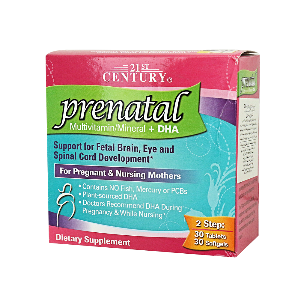 پریناتال مولتی ویتامین مینرال + دی اچ ای 21 سنتری در هر جعبه حاوی یک بسته 30 عددی قرص مولتی ویتامین یک بسته 30 عددی کپسول ژلاتینی DHA (دکوزاهگزانوئیک اسید) است. مولتی ویتامین پریناتال حاوی مواد معدنی و ویتامینهای مورد نیاز برای سلامتی بدن مادر و جنین است. کپسول ژلاتینی DHA (دکوزاهگزانوئیک اسید) نیز حاوی دکوزاهگزانوئیک اسید (اصلیترین اسید چرب امگا 3) است. مطالعات بالینی نشان داده که مصرف میزان کافی از این ماده حین بارداری و شیردهی تاثیر بسزایی در سلامت مغز و عملکرد بینایی دارد. برند 21 سنتری این محصول را به عنوان بهترین مولتی ویتامین دوران بارداری و شیردهی عرضه نموده است. پریناتال مولتی ویتامین مینرال + دی اچ ای 21 سنتری جهت حفظت سلامت مادر و تکامل رشد سالم جنین در نظر گرفته شده است.