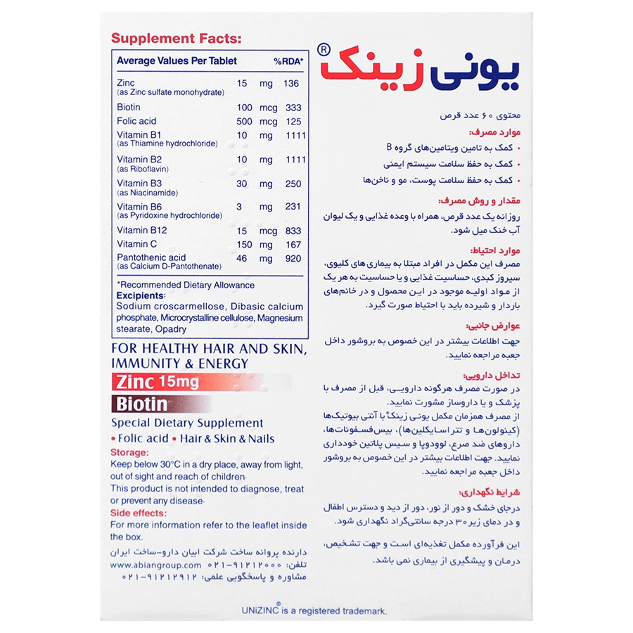 - ویتامین C: دارای خاصیت آنتی اکسیدانی است و باعث بالا رفتن مقاومت بدن بر علیه عفونتها میشود. ویتامین ث موجود در قرص Uni Zinc نقش مهمی در متابولیسم پروتئین و کلاژن سازی دارد. اختلال در سنتز کلاژن موجب تاخیر در بهبود زخمها میشود.