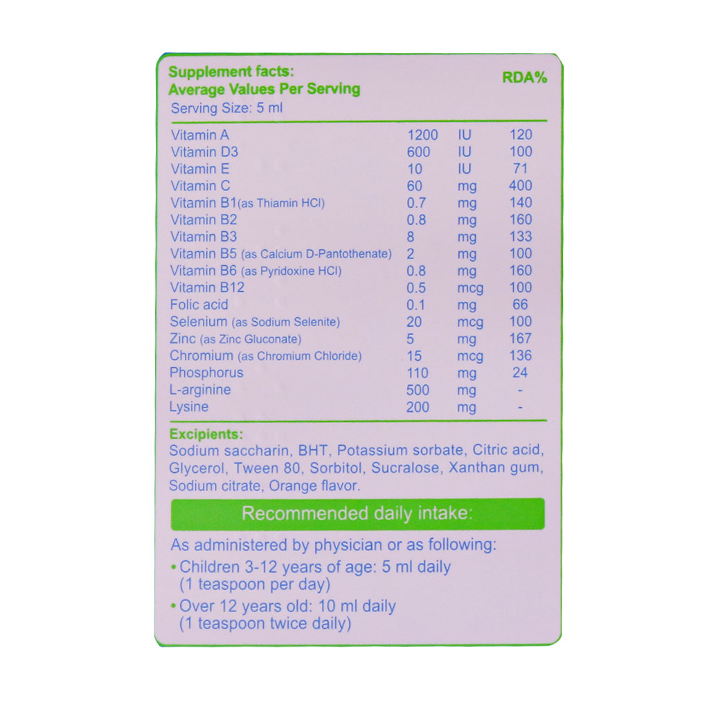 علاوه بر آن ید جهت رشد، عملکرد ادراکی و تولید هورمونهای تیروئید و عملکرد طبیعی آن مورد نیاز است. در شربت لیکو آپ ابیان فارمد انواع ویتامینها و مواد معدنی مانند ویتامین A، ویتامین D3، ویتامین E، ویتامین C، ویتامینهای گروه ب، ال آرژینین، فسفر، لیزین، سلنیوم، فولیک اسید، زینک و کروم وجود دارد که همگی به تقویت سیستم ایمنی و رشد کودک کمک میکنند.
