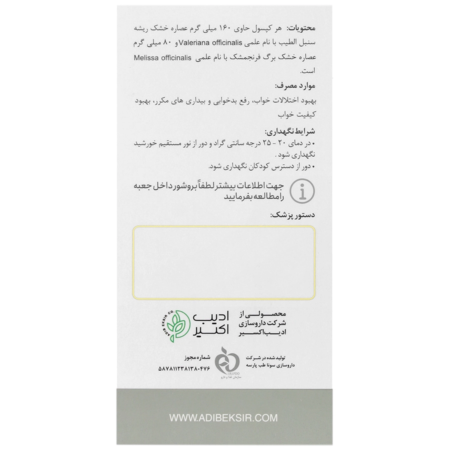 در این میان کپسول ویل نایت ادیب اکسیر با داشتن عصارههای گیاهی ریشه سنبل الطیب و عصاره برگ فرنجمشک (بادرنجویه) جهت بهبود اختلالات خواب استفاده میشود. همچنین از این مکمل جهت درمان افسردگی ناشی از کمبود ملاتونین نیز بهرهمند شد.