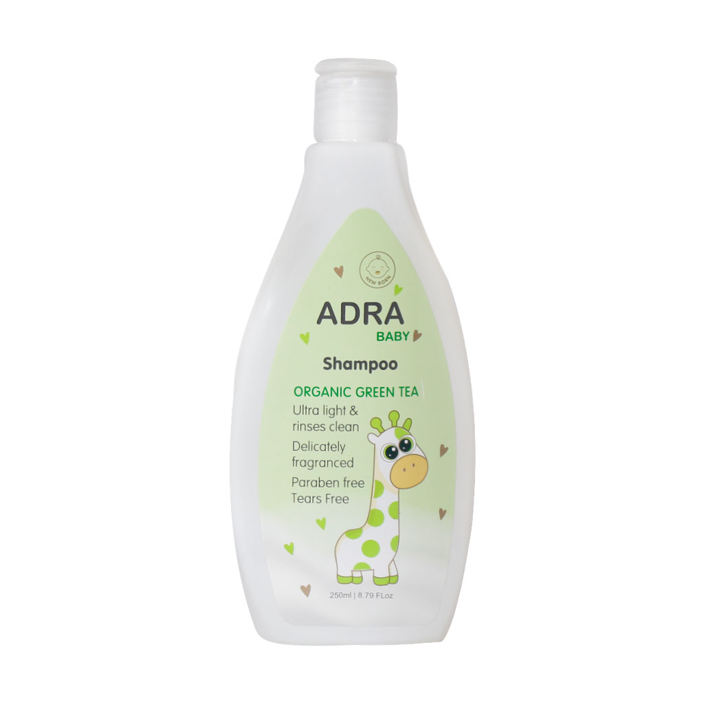 فرمولاسیون شامپو سر بچه عصاره چای سبز آدرا به گونه‌ای طراحی شده است که با پوست و مو کودک سازگار بوده و هیچ گونه حساسیتی ایجاد نمی‌کند. استفاده از این شامپو به هیچ عنوان چشم‌های کودک را نمی‌سوزاند و احساس ناراحتی برای وی به وجود نمی‌آورد. این فرآورده با داشتن عصاره چای سبز علاوه بر ایفای نقش آنتی اکسیدانی روی ساقه مو و پوست سر، ریزش مو را کاهش می‌دهد و سبب شفافیت رنگ موهای کودک شما می‌شود. PH مناسب و نداشتن هر گونه پارابن و سدیم لوریل اتر سولفات در شامپو نوزاد آدرا باعث لطافت مو شده و استفاده از آن برای کودکان یا بزرگسالان با موهای ضعیف و شکننده مفید خواهد بود.