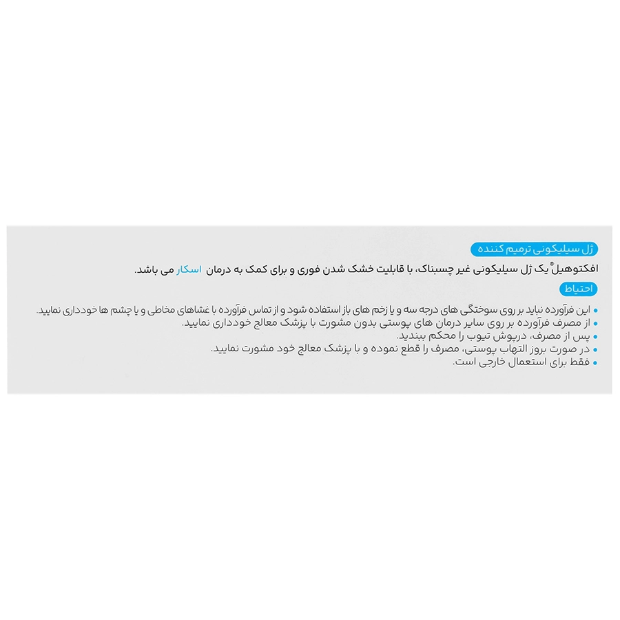 از افکتوهیل میتوان برای آثار به جای مانده زخم در سطوح نامنظم بدن، صورت و پوست قسمتهای متحرک مانند مفاصل استفاده نمود و حتی بر اسکارهای جدید و قدیمی اثربخش خواهش بود. میتوان گفت این محصول یک گزینه مناسب برای افرادی است که به دنبال درمان اسکار و داشتن پوستی سالمتر هستند. افکتوهیل در بستهبندی تیوپی 15 میلی لیتری توسط شرکت هیلیا فارمد به سفارش شرکت توسعه طب آدریان سلامت تولید شده است. گفتنی است جهت بهبود کامل و موثر پوست آسیب دیده، در کنار این محصول میتوانید اقدام به خرید مرطوب کننده و استفاده از آن نمایید.