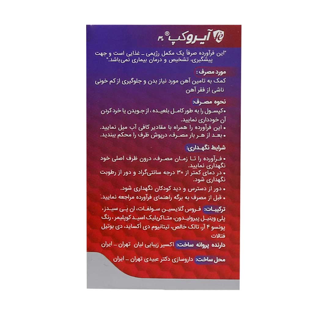کپسول آیروکپ آدریان به صورت کپسولهای انتریک کوتد خوراکی و به رنگ قهوه ای مایل به قرمز ( سر و بدن ) حاوی پلت انتریک کوتد فروس گلایسین سولفات یعنی معادل 30 میلی گرم آهن دو ظرفیتی است. این محصول در جعبههای 30 عددی به سفارش توسعه طب آدریان سلامت، توسط داروسازی دکتر عبیدی عرضه میشود. مصرف این کپسول به تامین آهن مورد نیاز بدن و جلوگیری از کم خونی ناشی از فقر آهن میپردازد.