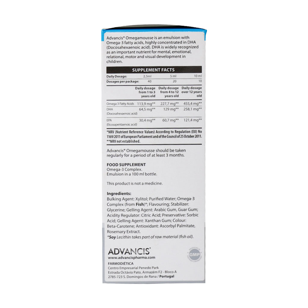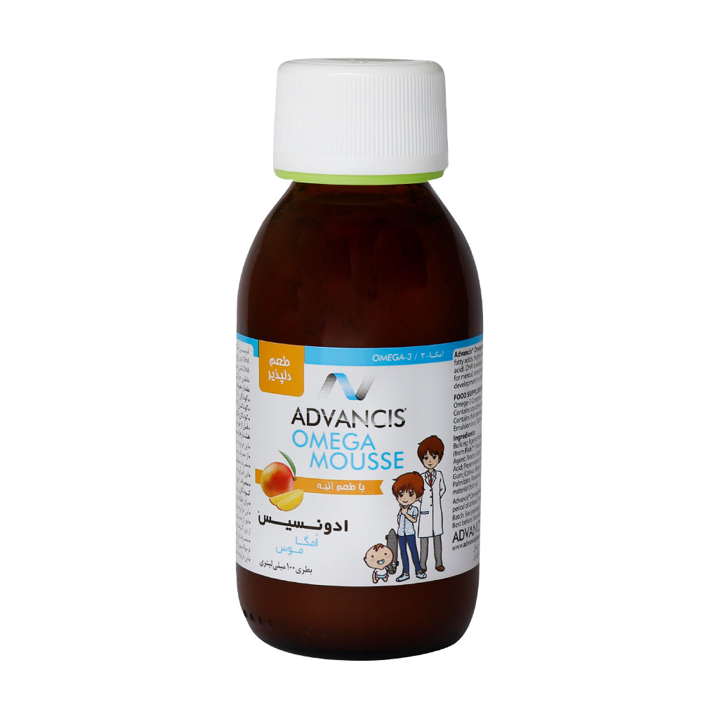 شربت امگا موس ادونسیس جهت تقویت رشد کودکان موثر است. این محصول بدون عارضه و نگهدارنده بوده و در بدن کودک به سرعت جذب میشود. امولسیون ادونسیس از طعم فوق العاده دلپذیر انبه تهیه شده است. این فراورده حاوی اسیدهای چرب امگا 3 بوده و در هر 10 میلی لیتر 455.4 میلی گرم امگا 3 و دی اچ ای 272 میلی گرم و ای پی آ 128 میلی گرم دارد.