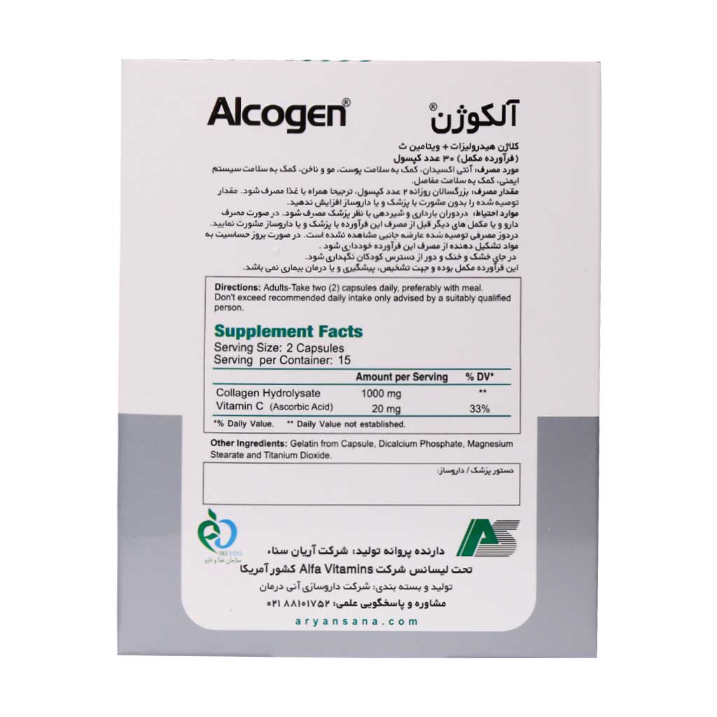 کپسول آلکوژن با ویتامین C آلفا ویتامینز یک مکمل غذایی است که به توسعه بافت ماهیچه ها، جوانسازی پوست و مو و نیز انعطاف پذیری و استحکام غضروف و استخوان کمک می کند. ذرات فعال شده کلاژن، یک پروتئین است که بطور طبیعی در بیشتر بافت های بدن یافت می شود و با افزایش سن کاهش می یابد. این مکمل موجب شکل دهی و تحریک پذیری اندام هایی مثل پوست، تاندون ها، استخوان، ماهیچه ها، رگ های خونی، ناخن ها، چشم و اعضای داخلی بدن می شود. این ماده یک عنصر حیاتی در انعطاف پذیری و استحکام بدن می باشد زیرا عملکرد آنها را به هم مرتبط می کند و به نگهداری مایعات ضروری بدن کمک می کند. فعالیت فیزیکی، رژیم غذایی، وزن بدن و شرایط مختلف سلامتی تاثیر مستقیم بر پوشش غضروف، قدرت استخوان ها، ماهیچه ها و تاندون ها داشته ونیز بر قدرت الاستیسیته پوست و شکنندگی مو و ناخن ها موثر است.