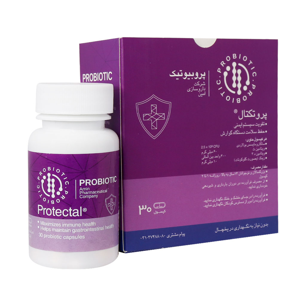 کپسول پروتکتال امین یک مکمل پروبیوتیک ساخت ایران بوده که دارای ترکیبات مفیدی همچون ساکارومایسس بولاردی، ویتامین C، ویتامین D3 و زینک بوده که جهت تقویت و ارتقا سلامت سیستم ایمنی بدن تهیه شده است و سلامت دستگاه گوارش را حفظ می‌نماید و عملکرد آن را نیز بهبود می‌بخشد. Protectal تعادل بین باکتری‌های خوب و بد را برقرار نموده و عملکرد بدن را بهتر می‌کند. این قرص تقویت سیستم ایمنی بدن با خاصیت آنتی اکسیدانی از بدن در برابر رادیکال‌های آزاد محافظت می‌کند.
