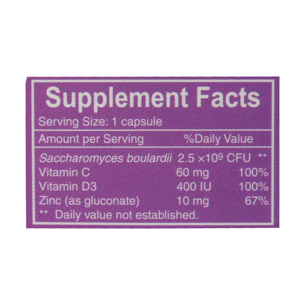 در این مکمل، ترکیبات موثر و مفیدی به چشم می‌خورد که همگی در تقویت سیستم ایمنی بدن و سلامت دستگاه گوارش نقش مثبتی دارند. ساکارومایسس بولاردی موجود در این محصول یک گونه مخمر بوده که به عنوان پروبیوتیک شناخته شده است و به منظور بهبود وضعیت فلور میکروبی روده بزرگ و کوچک به کار می‌رود. ویتامین سی هم با خاصیت آنتی اکسیدانی به تولید کلاژن، تقویت سیستم ایمنی بدن و پیشگیری از ضعف بینایی می‌پردازد.