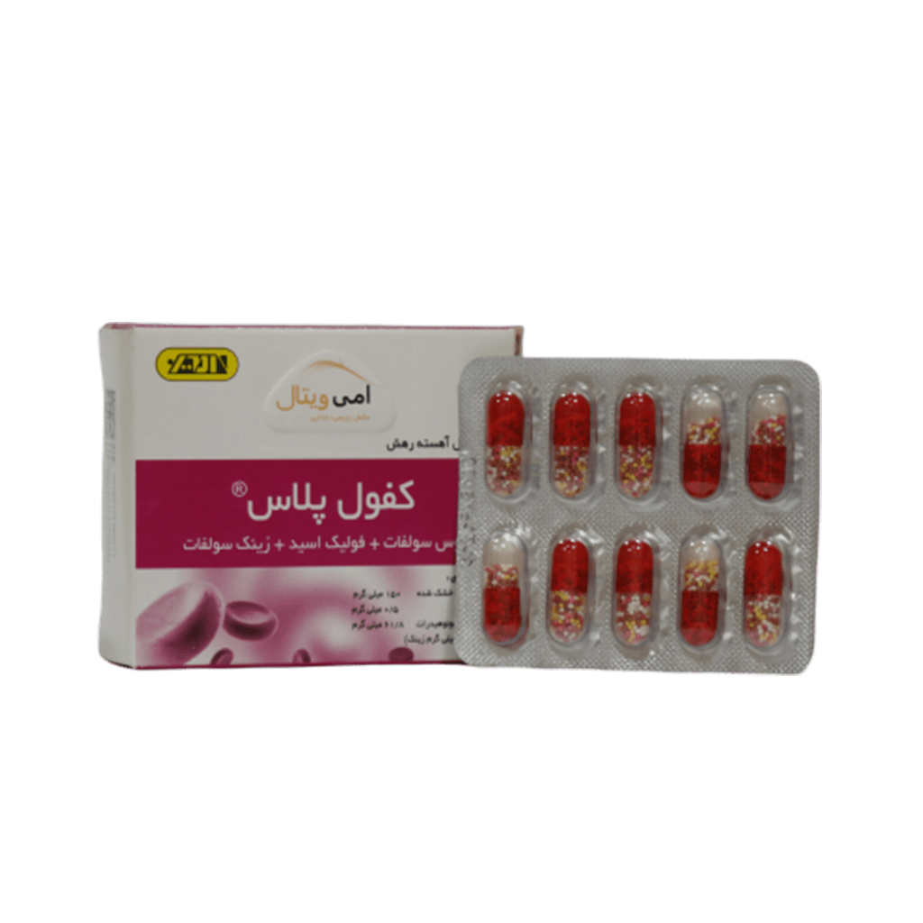 کپسول کفول پلاس امی ویتال حاوی فروس سولفات، فولیک اسید و زینک سولفات جهت رفع کم خونی است.