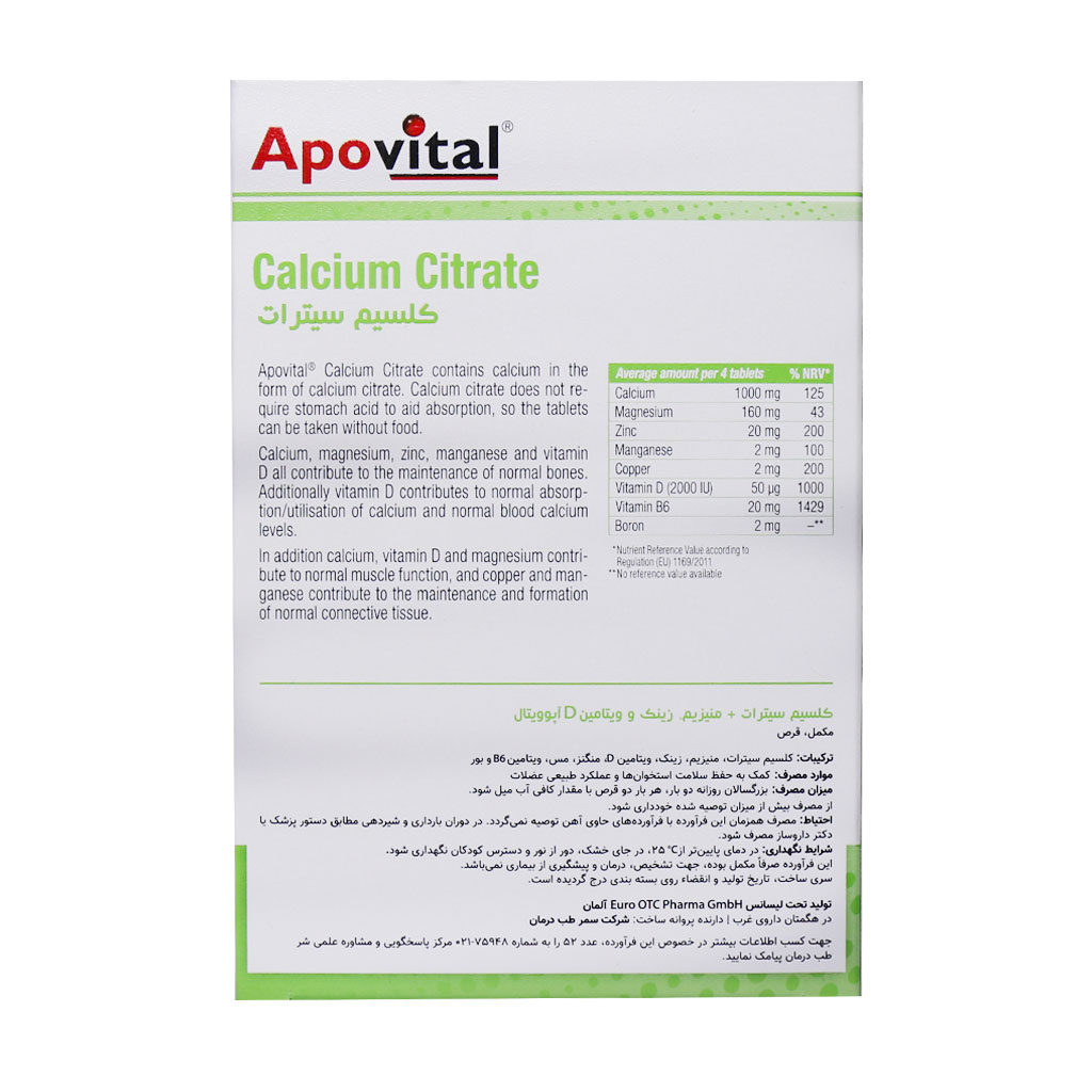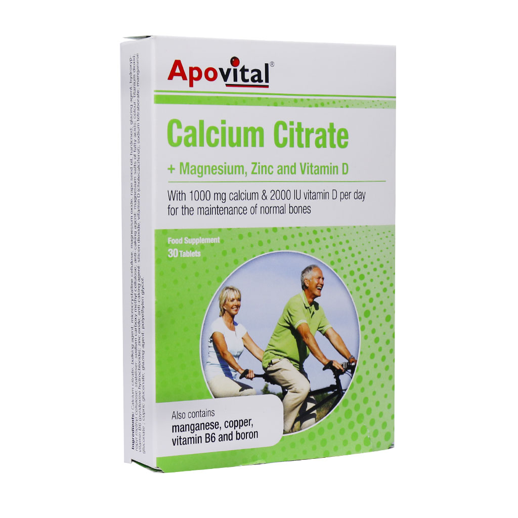 قرص کلسیم سیترات همراه با منیزیم زینک و ویتامین D آپوویتال مجموعه کاملی از ویتامینها و مواد معدنی بوده که به سلامت استخوانها، عضلات، بافت همبند کمک میکند. مصرف این محصول در سنین بالاتر از پوکی استخوان پیشگیری میکند.