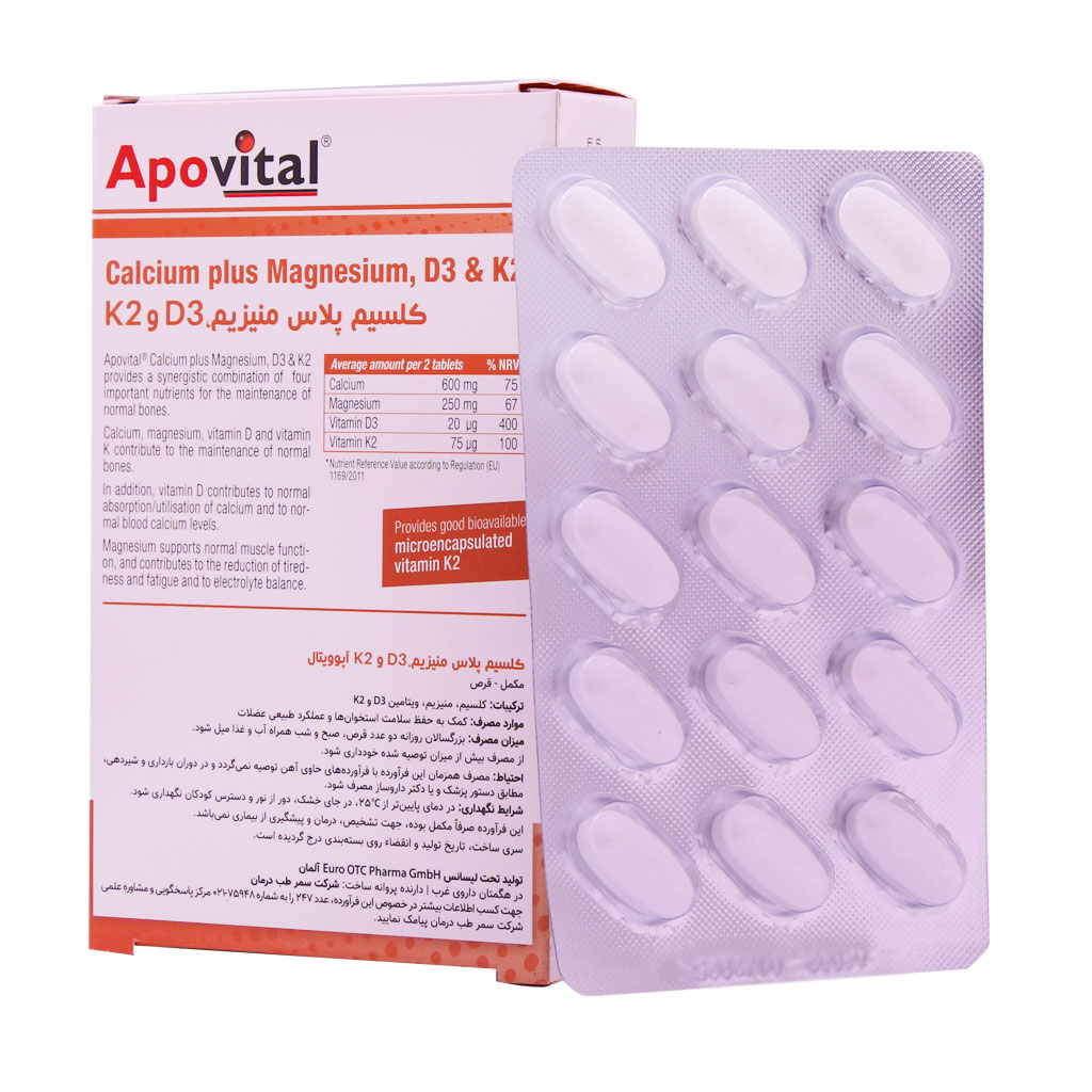 قرص کلسیم پلاس منیزیم ویتامین D3 و K2 آپوویتال 30 عدد