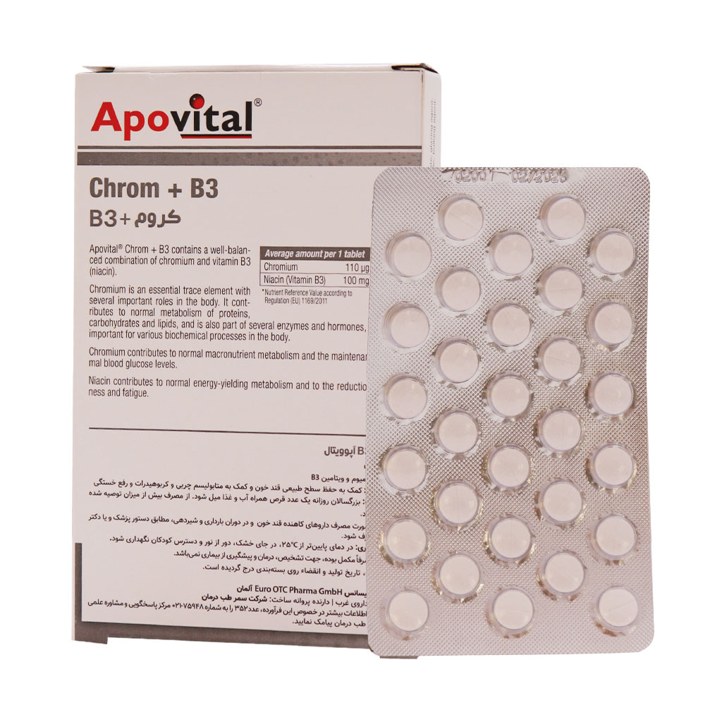 قرص کروم و ویتامین ب3 آپوویتال مکملی است که با تامین این دو ترکیب الزامی، باعث کمک به حفظ سطح طبیعی قند خون، متابولیسم چربی و کربوهیدرات و رفع خستگی می‌شود.