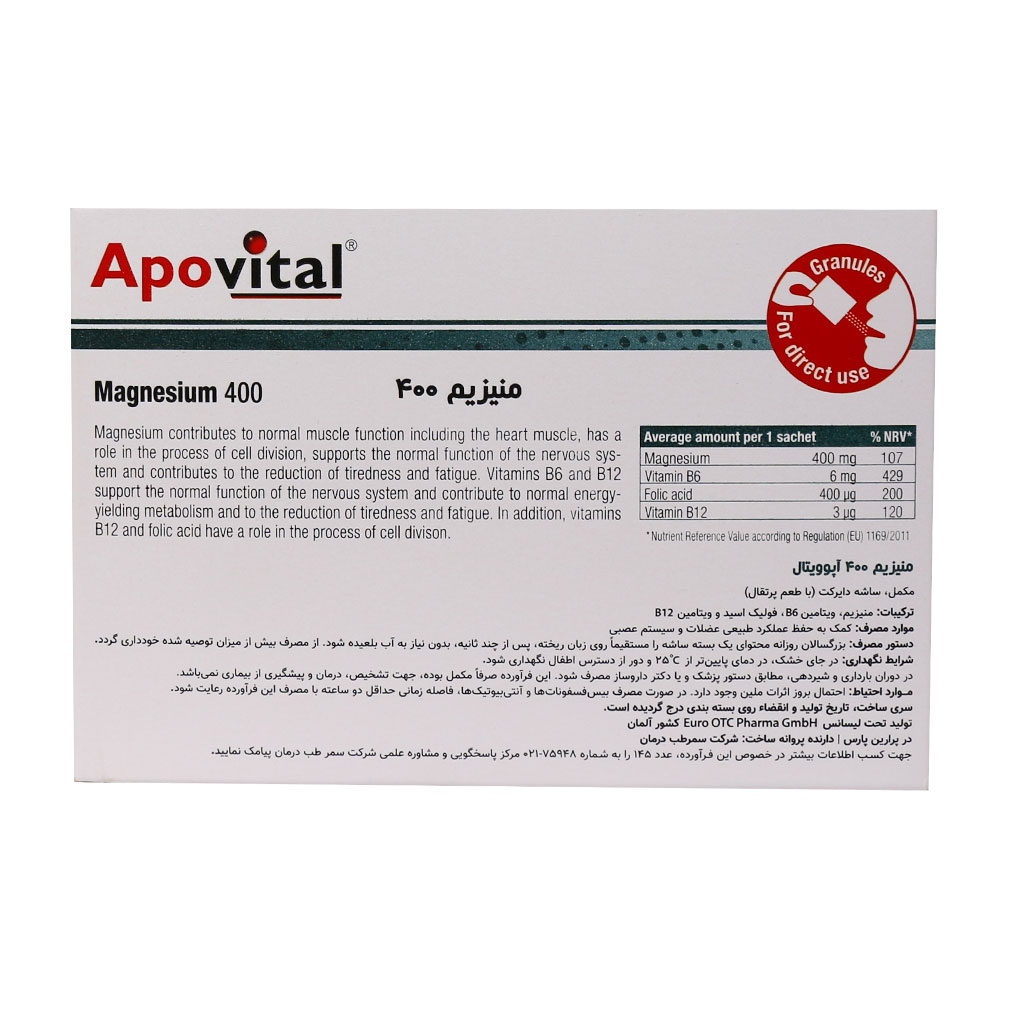 ساشه منیزیم 400 آپوویتال علاوه بر تامین منیزیم مورد نیاز بدن، باعث افزایش انرژی و بهبود گرفتگی عضلات می‌شود. این ساشه حاوی منیزیم، ویتامین‌های B6، B12 و فولیک اسید است.