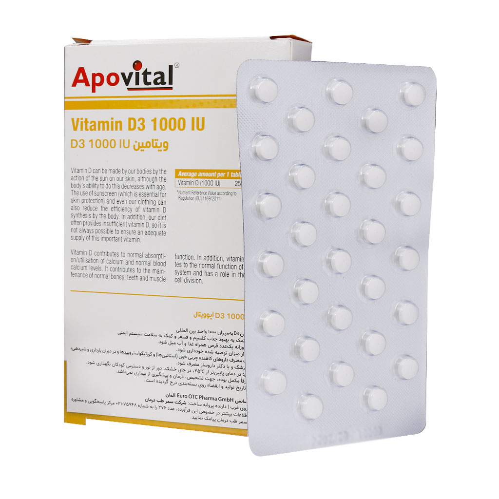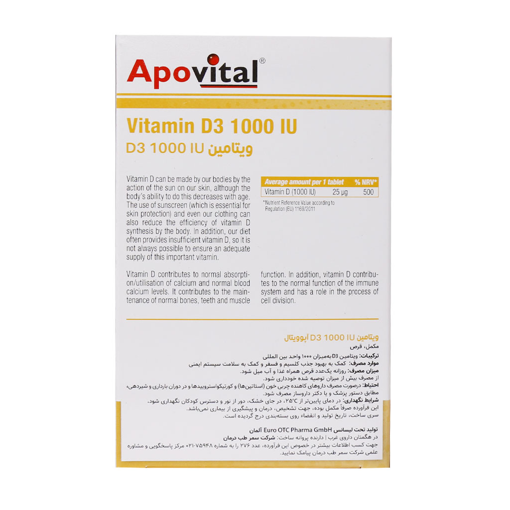 قرص ویتامین D3 1000 واحد آپوویتال یک مکمل غذایی جهت تامین ویتامین دی مورد نیاز بدن است. این محصول علاوه بر تقویت سیستم ایمنی، به بدن در جذب بهتر کلسیم و فسفر کمک می‌کند. از جمله علائم کمبود ویتامین D در بدن می‌توان به خستگی مفرط، ضعف عمومی بدن، کمر درد، افسردگی، ریزش مو، پوکی استخوان، درد عضلانی و افزایش وزن اشاره کرد. نیاز روزانه افراد بالغ زیر 70 سال به ویتامین دی ۶۰۰ واحد و برای افراد بالای 70 سال 800 واحد است. برای تامین ویتامین دی مورد نیاز بدن می‌توانید علاوه بر مصرف مکمل‌های تخصصی، از سالمون، شیر سویا، قارچ، میگو، زرده تخم مرغ و جودوسر نیز استفاده کنید.