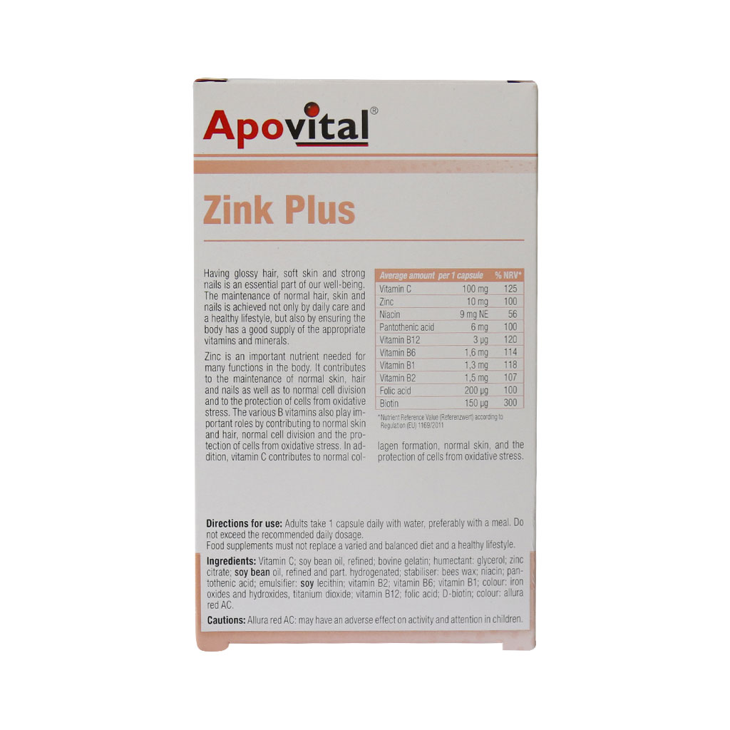 کپسول زینک پلاس آپوویتال حاوی مواد معدنی و ویتامینهای گروه B و ویتامین C که سبب کمک به حفظ سلامت پوست، مو و ناخن و همچنین کمک به کلاژن سازی طبیعی پوست میشود.