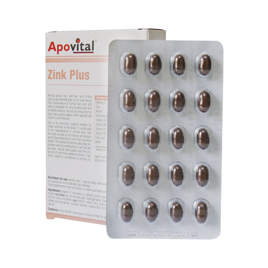 زینک موجود در کپسول زینک پلاس اپوویتال پس از آهن دومین عنصر کمیابی است که به وفور در بدن توزیع شده است. زینک سبب ترمیم بافتهای از بین رفته مو میشود و زخم را التیام میبخشد و به طور فعال در فرایند ترمیم پوست کمک میکند. و نیز در درمان التهابات و اختلالات پوستی نقش مهمی را ایفا میکند، همچنین این ماده در عملکرد سیستم ایمنی، سنتز پروتئین، ترمیم زخم، سنتز DNA و تقسیم سلولی نقش دارد. کمبود آن یکی از دلایل متعدد خستگی، ضعف و کاهش اشتها، ریزش مو، و اختلالات متعدد در پوست است. کمبود شدید زینک باعث تاخیر در بهبود زخمهای ایجاد شده پوست، عفونتهای متعدد هیپوگنادیسم در مردان و ضایعات پوستی و چشمی و نیز کاهش در قدرت عملکرد حس بویایی و چشایی میشود.