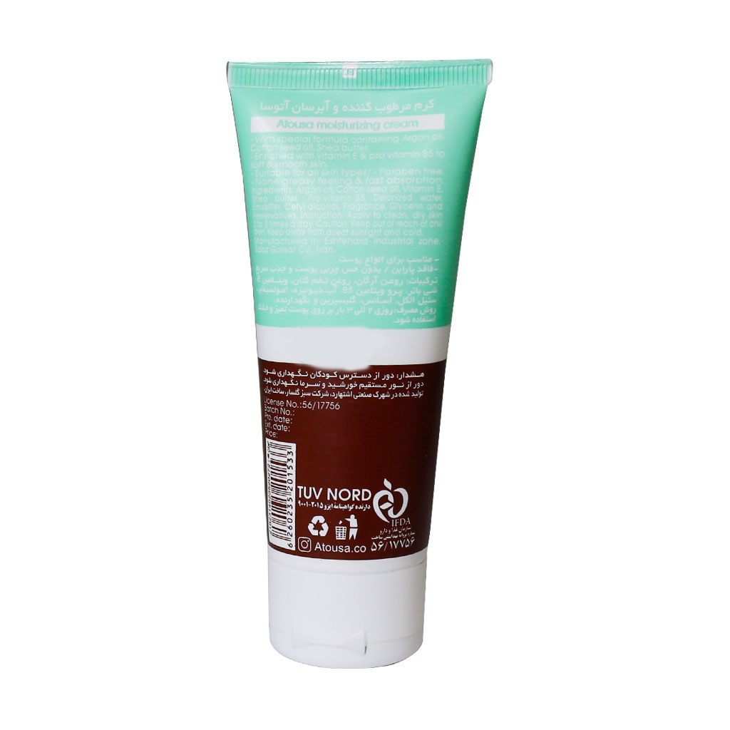 کرم مرطوب کننده و آبرسان دست آتوسا بدون جا گذاشتن چربی و براقی روی پوست جهت نرم کردن و جلوگیری از خشکی پوست برای انواع پوست مناسب است.