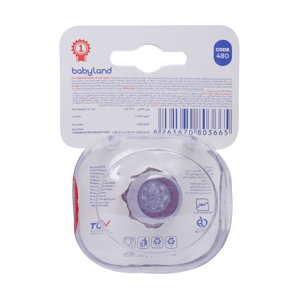 پستانک یکی از اقلام مهم در لوازم کودک و سیسمونی است. پستانک در تسکین گریه‌های کودک نقش داشته و سبب آرامش او می‌شود. همچنین استفاده از پستانک می‌تواند از سندرم ناگهانی نوزاد که به مرگ کودکان یک ماهه تا یک ساله هنگام خواب گفته می‌شود، جلوگیری کند. اگر احیانا نوزادی علاقه به مکیدن پستانک نداشت، به هیچ وجه در انجام این کار اصرار نکنید. پستانک فندقی شب تاب بیبی لند کد 480 برای نوزادان از بدو تولد تا شش ماهگی مناسب است. سری آن از نوع گرد و از جنس سیلیکون است و با یک درپوش از ورود آلودگی و باکتری به پستانک محافظت می‌کند. دسته این پستانک از نوع شب تاب است که در هنگام تاریکی به روشنی می‌درخشد. این پستانک متناسب با فرم فک و دهان نوزاد طراحی شده است. این محصول دارای منفذ روی بدنه جهت جریان عبور هوا روی پوست نوزاد است و به هیچ عنوان روی پوست صورت او جا نمی‌اندازد. جنس پستانک فاقد مواد مضر بوده و برای کودک هیچ گونه حساسیتی ایجاد نمی‌کند.