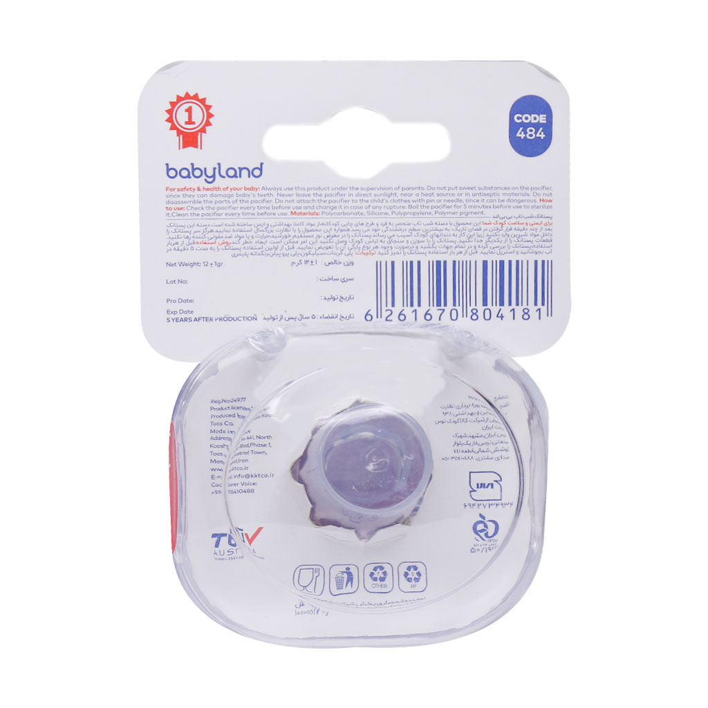 پستانک ارتودنسی شب تاب بیبی لند کد 484 با دسته شب تاب و سری سیلیکونی وسیله ای برای آرام کردن نوزاد هنگام گریه است. این پستانک فاقد مواد مضر است و برای نوزادان تازه متولد شده تا 6 ماهه مناسب است.
