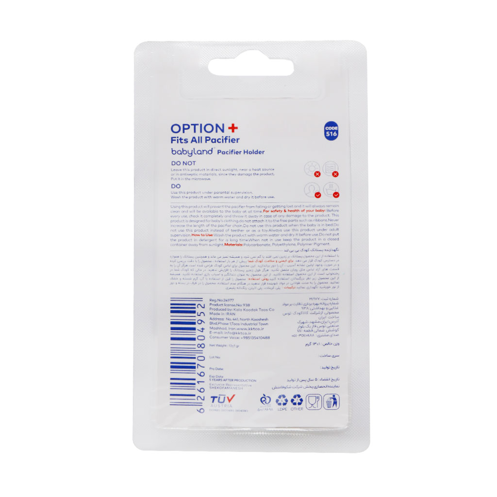 بند نگهدارنده پستانک بیبی لند کد 516 بهترین وسیله برای نگه داشتن پستانک است. این وسیله میتواند از آلوده شدن یا گم شدن پستانک جلوگیری نماید.