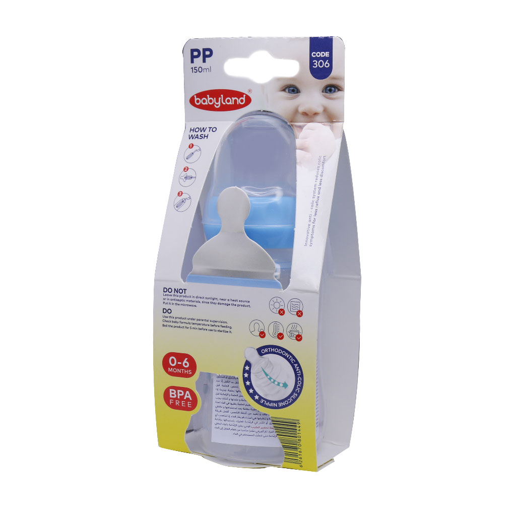 شیشه شیر بیبی لند کد 306 مناسب 0 تا 6 ماه از جنس پلی پروپیلن و مواد مرغوب و با کیفیت ساخته شده است و فاقد مواد مضر PBA است. این شیشه شیر خوب، محصولی از برند معتبر بی بی لند babyland است. وزن بسیار سبک، خاصیت نشکن، سری ارتودنسی ارگونومیک از جمله ویژگیهای این شیشه است که آن را از سایر شیشه شیرها متمایز کرده است. این شیشهشیر با بدنهای از جنس پلیپروپیلن، ظرفیتی برابر ۱۵۰ میلیلیتر را به خود اختصاص داده است. سرشیشه این مدل از جنس سیلیکون بوده و انعطافپذیر است. این سری به وسیله درپوش پلاستیکی شفافی پوشانده میشود. درپوش شیشه شیر نوزاد بیبی لند به راحتی باز و بسته شده و از نشت شیر به بیرون از بطری جلوگیری میکند. درجه بندی واضح روی شیشه هم دیگر ویژگی خاص این محصول است که آن را تبدیل به بهترین شیشه شیر کرده است.