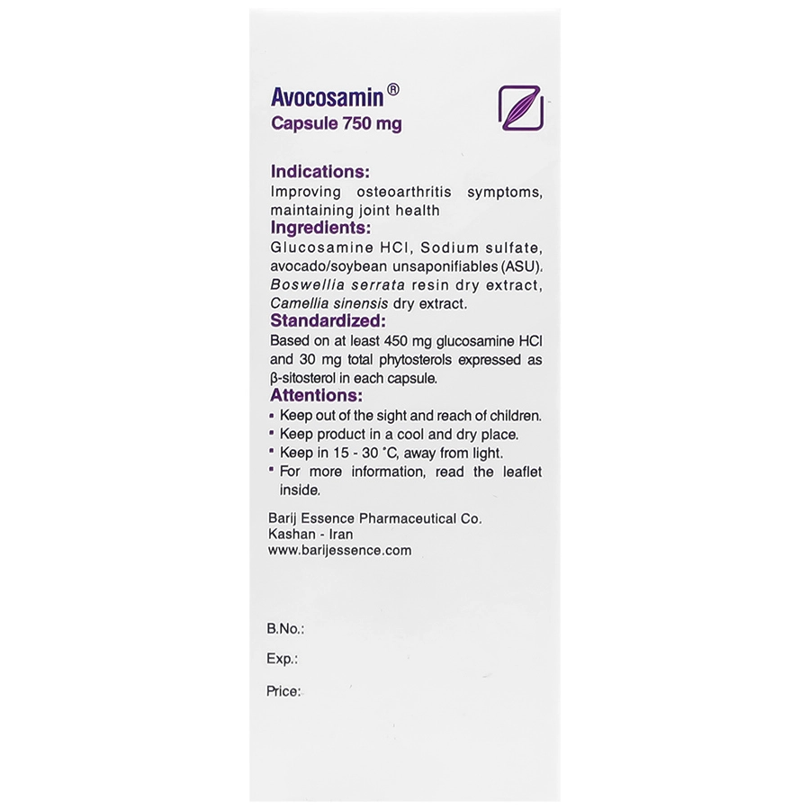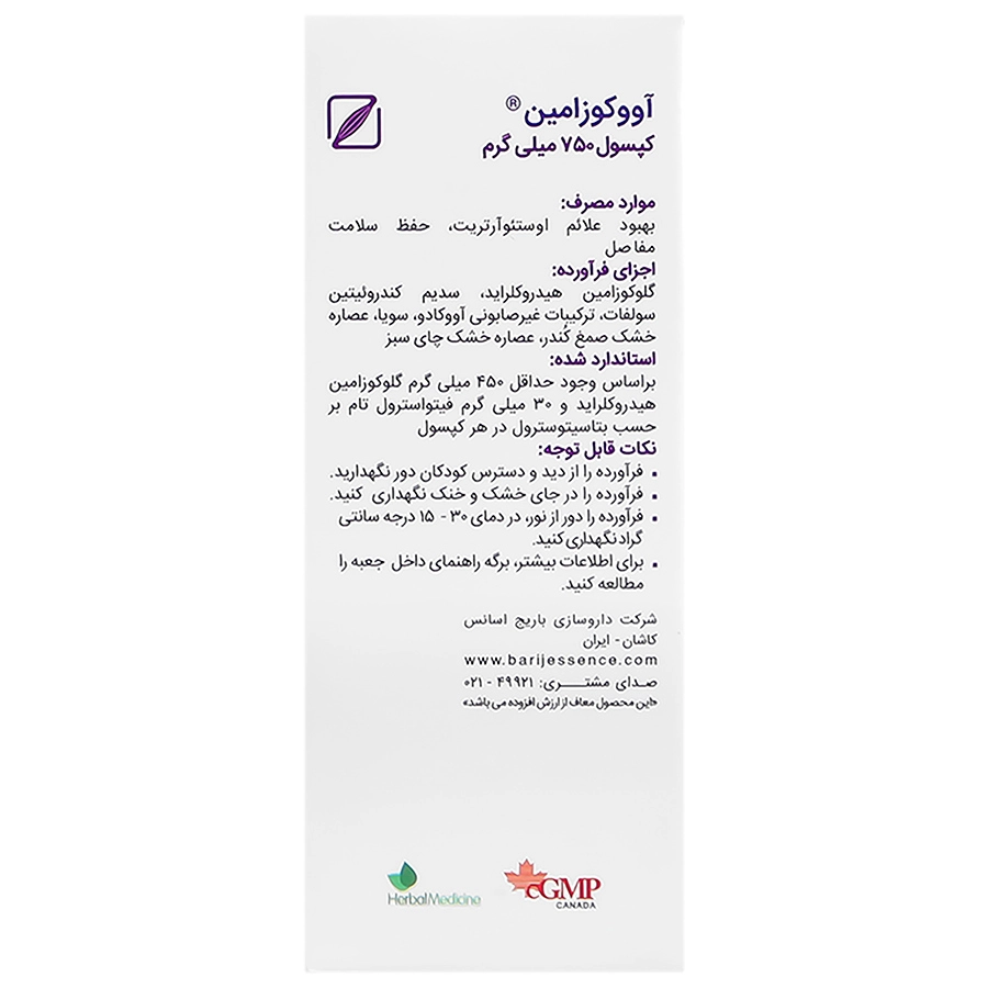 کپسول آووکوزامین 750 میلی گرم باریج مکملی گیاهی و موثر برای کمک به بهبود عملکرد مفاصل و کاهش التهاب است که در ادامه به بررسی ترکیبات موثر موجود در آن میپردازیم: