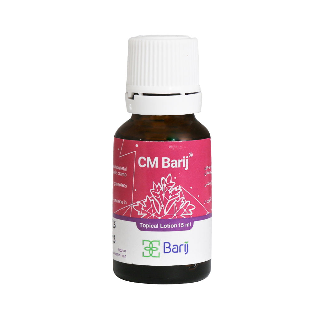 لوسیون سی ام باریج اسانس حاوی اسانس نعنا و کرفس بوده که در تسکین دردهای عضلانی، اسکلتی، درد استئوآرتریت، کشیدگی تاندونی و گرفتگی عضلانی موثر است.