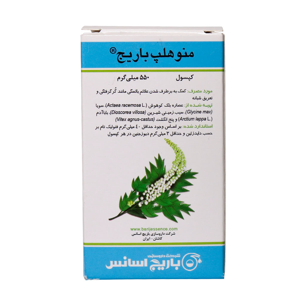 کپسول منوهلپ باریج اسانس ترکیبی از گیاهان سویا، سیب زمینی، بابا آدم و پنج انگشت است. از دیگر مواد تشکیل دهنده این محصول میتوان به کلروژنیک اسید، آگنوزید و دیوسجنین اشاره کرد. این ترکیبات گیاهی میتواند جایگزین خوبی برای HRT باشد. مصرف کپسول منوهلپ تاثیرات مفیدی بر علائم یائسگی و استخوانها دارد در صورتی که فاقد اثرات استروژنی روی بافت رحم و پستان است.