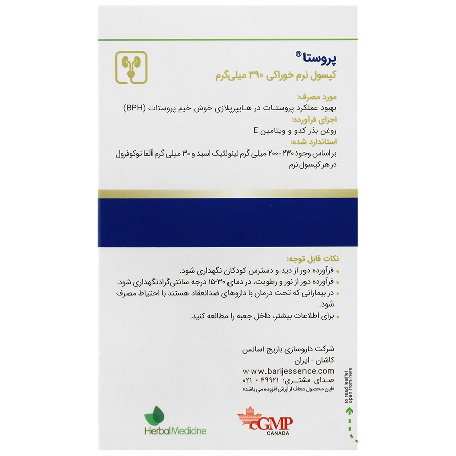 ویژگی های کپسول نرم پروستا 390 میلی گرم باریج اسانس