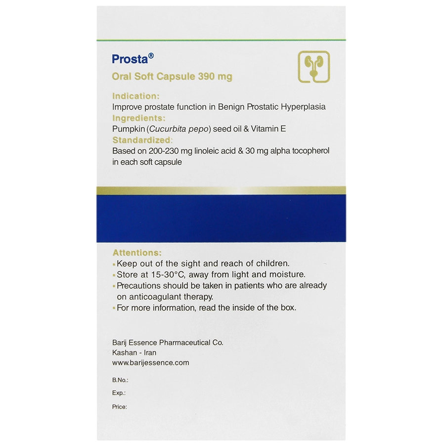 کپسول نرم پروستا ۳۹۰ میلی گرم باریج اسانس بر اساس وجود ۲۳۰ – ۲۰۰ میلی گرم لینولئیک اسید و ۳۰ میلی گرم آلفا توکوفرول در هر کپسول فرموله شده است. این کپسول بر روی اندازه غده پروستات و باعث بهبود عملکرد ادراری می شود.