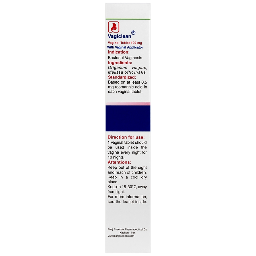 قرص واژینال واژی کلین باریج محصولی حاوی مرزنجوش و بادرنجبویه و رزمارینیک اسید برای جلوگیری از بیماریهای قارچی و باکتریایی، تنظیم PH واژن و درمان عفونت و خشکی واژن است که خواص ضد التهابی هم دارد. قرص گیاهی Vagiclean با ترکیبات موثرش قادر است به درمان عفونت باکتریال یا BV بپردازد. این قرص برای استعمال بیرونی است.