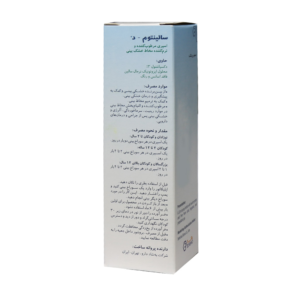 اسپری بینی سالینتوم د بهشاد دارو حاوی دکسپانتنول 3 درصد و محلول نرمال سالین ایزوتونیک است که مرطوب کننده و نرم کننده مخاط خشکی بینی است.