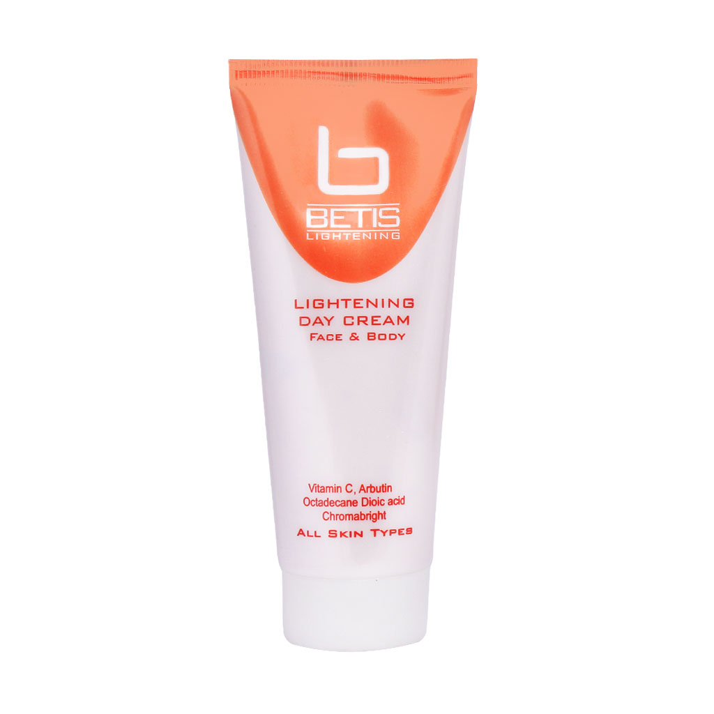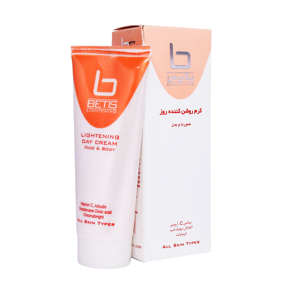 کرم روشن کننده روز بتیس بر پایه کمپلکس ویتامین C و کروما برایت فرموله شده و قابلیت از بین بردن موثر و تدریجی لک و تیرگی صورت و بدن را دارد.