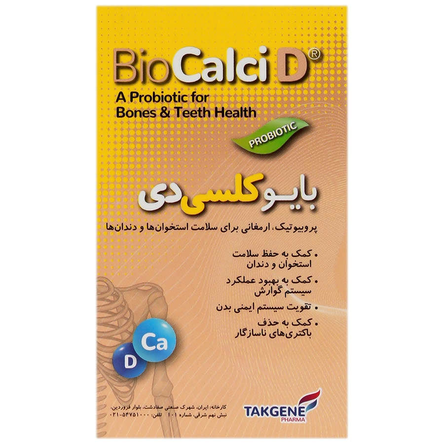کپسول بایو کلسی دی افزون بر حذف باکتری های ناسازگار با بهبود استحکام و جلوگیری از پوکی استخوان نیز در ارتباط است. بایو کلسی دی تک ژن فارما در قوطی های پلاستیکی 30 عددی توسط شرکت زیست محصول پارسیان در ایران تولید می شود.