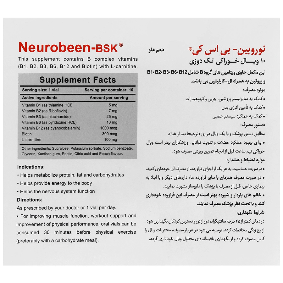 ویال نوروبیون حاوی 10 عدد ویال خوراکی که تامین کننده ویتامین‌های گروه B به همراه ال کارنیتین است و می‌تواند جایگزین خوبی برای آمپول نوروبیون باشد. ویتامین‌های ذکر شده در ویال نوروبین بی اس کی باعث افزایش متابولیسم انرژی بدن می‌شود و تاثیر مستقیمی بر متابولیسم چربی‌ها، کربوهیدرات‌ها و پروتئین‌ها دارد. ویال خوراکی نوروبین بنیان می‌تواند یک مکمل مناسب برای ورزشکاران نیز باشد و باعث افزایش قدرت عضلات و همچنین بهبود عملکرد ورزشی آنها شود.