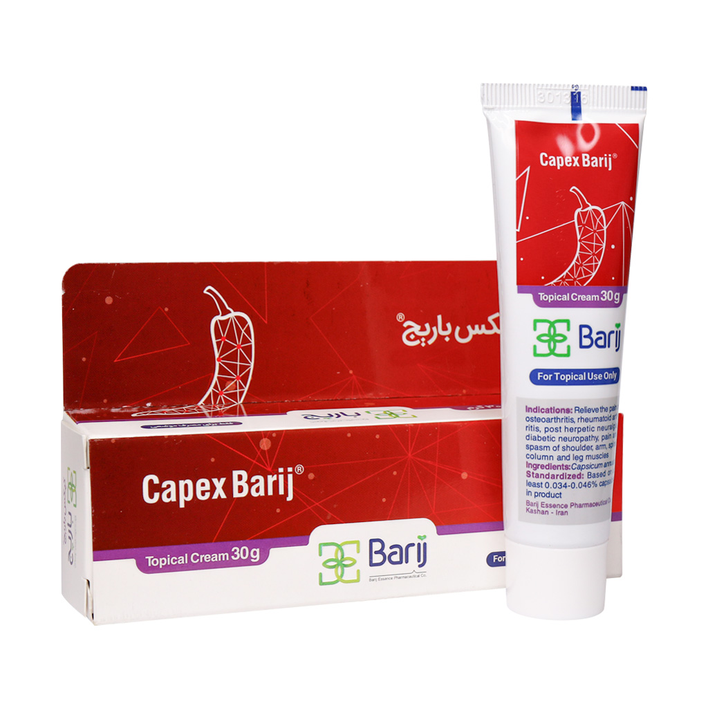 کرم کپکس باریج اسانس برای مدیریت درد از فرمولاسیون­‌های موضعی حاوی کپسایسین استفاده می‌کند. با بررسی تعدادی از متاآلینیزها، مشخص شده است که ایمنی مصرف و اثربخشی فرمولاسیون­‌های دارای غلضت‌های کم کپسایسین نسبتا کم است. امروزه در کشور­­های اروپایی و ایالات متحده آمریکا، پچ‌های حاوی غلضت 8 درصد کپسایسین نیز تایید شده است و می­توان با یک بار استفاده طی مدت زمان 1 ساعته در بیماران مبتلا به درد نوروپاتی، درد برای مدت 12 هفته کاهش و برطرف می­‌یابد. استفاده از این پچ خطرات کم اثرات سیستماتیک، تداخلات دارویی، مدت زمان اثر بخشی بیشتر و پذیرش بیمار را به دنبال دارد.