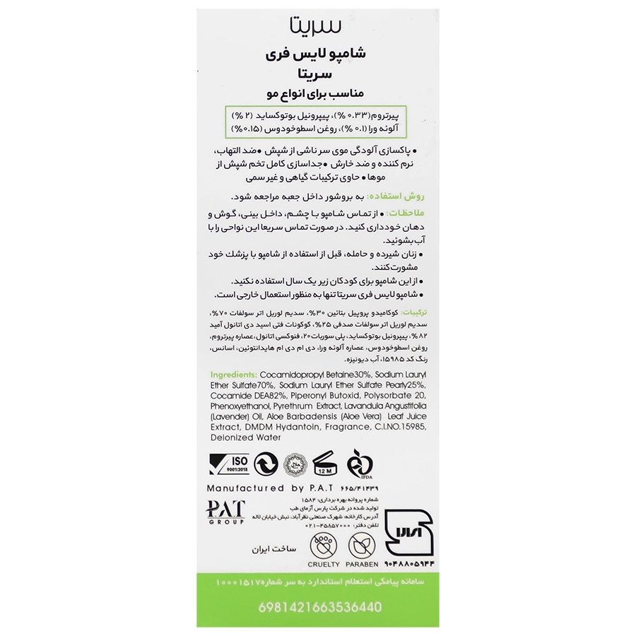شامپو ضد شپش لایس فری سریتا با دارا بودن مواد موثر گیاهی و طبیعی و با کمک مکانیزم‌های کارآمد، سبب مرگ شپش و نابودی تخم‌های آن می‌شود. این شامپو برخلاف سایر ترکیبات ضد شپشی که تولید شده است، هیچ گونه ضرری برای انسان ندارد. شامپو لایس فری سریتا دور کننده حشره، ضد باکتری و ضد قارچ بوده و با مسدود کردن منافذ تنفسی در شپش و تخم آن باعث مرگ شپش و نابودی تخم‌های آن می‌شود. اگر به دنبال راهکاری برای کنترل طول عمر شپش سر مطالعه مقاله “کنترل طول عمر شپش سر” را توصیه می‌کنیم. آلوئه ورا استفاده شده در این شامپو، رطوبت رسانی موثری داشته و به رفع پوسته ریزی در محل گزش شپش کمک می‌کند. همچنین آلوئه ورا خارش ناشی از گزش شپش را برطرف می‌سازد.