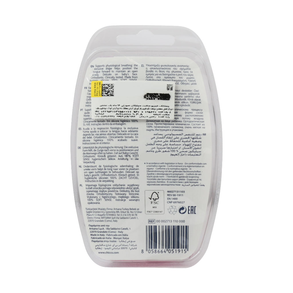 پستانک فیزیو سافت 16 تا 36 ماهگی چیکو از جنس سیلیکون ساخته شده است. در این محصول مواد BPA وجود ندارد و در نتیجه استفاده از آن سبب به خطر افتادن سلامتی کودک نمیشود. این پستانک بسیار نرم است و طراحی ارگونومیک آن سازگار با دهان کودک صورت گرفته است. در بسته بندی این محصول یک پستانک وجود دارد. این پستانک در حقیقت یک پستانک ارتودنسی است که از وارد شدن آسیب به فک و دندان کودک جلوگیری مینماید.