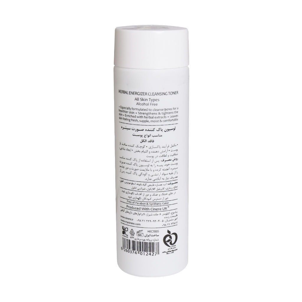 تونر پاک کننده صورت سینره آرامش دهنده و التیام بخش مناسبی جهت تکمیل مراحل پاکسازی پوست است و با به کار گرفتن عصاره ی گیاهان طبیعی پوست را کاملا تمیز و شفاف می سازد.