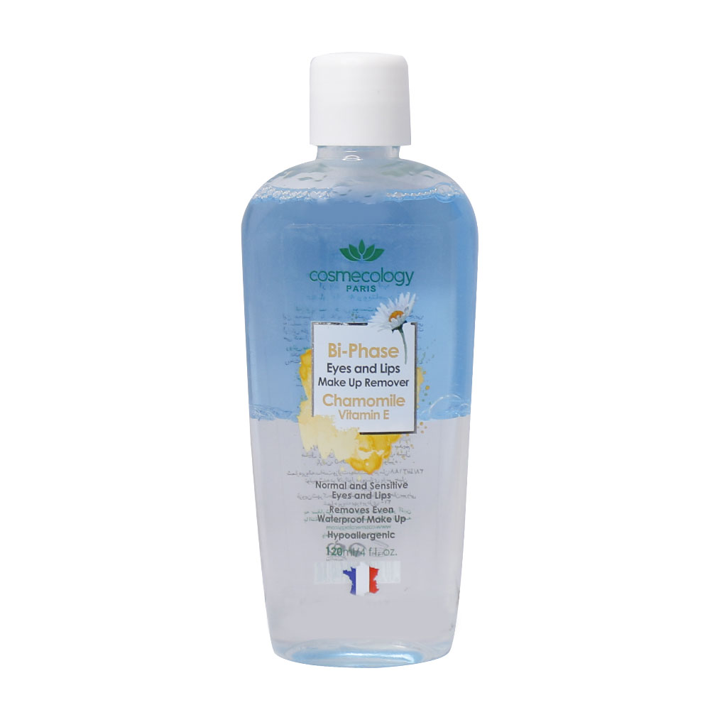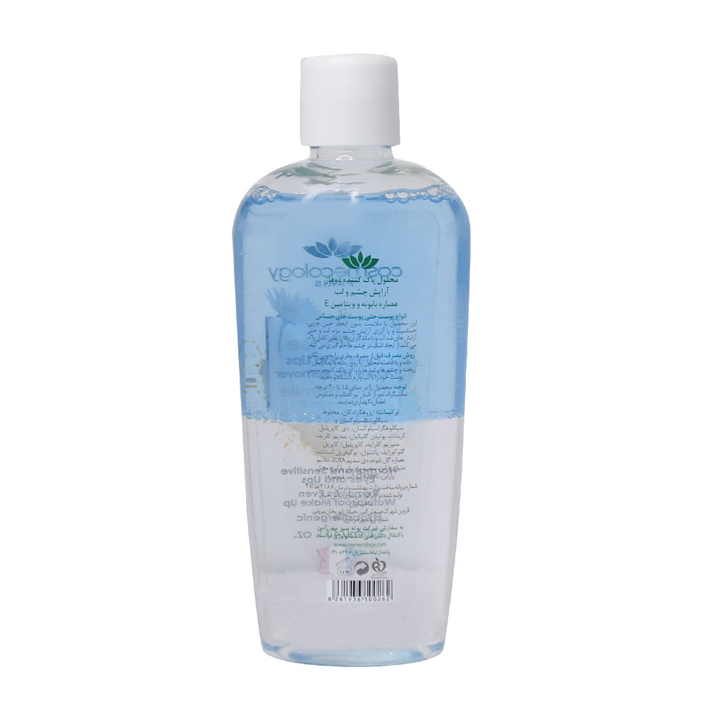 محلول پاک کننده دو فاز آرایش چشم و لب کاسمکولوژی محصولی مناسب جهت از بین بردن مواد شیمیایی فرآوردههای آرایشی است که با داشتن عصاره بابونه و ویتامین E مناسب انواع پوست است.