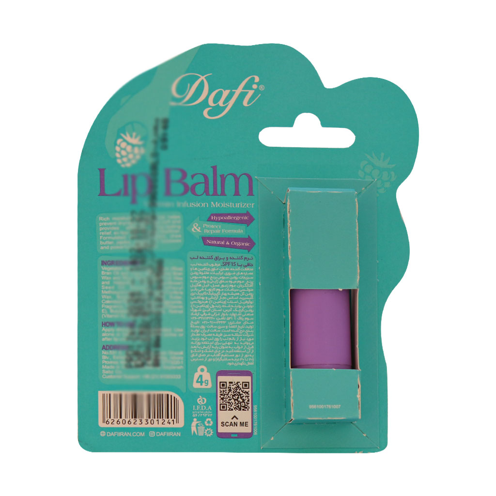 بالم لب دافی محصولی است که با دارا بودن SPF15 باعث محافظت کامل از لبها میشود. استفاده از نرم کننده لب دافی باعث رفع خشکی و ترک خوردن لبها شده و در طولانی مدت، لبها را صاف و ابریشمی میسازد. علاوه بر آن بالم لب SPF15 دافی از لبها در برابر آسیب محافظت نموده و در صورت بروز آسیب سبب ترمیم و بهبود آن میشود.