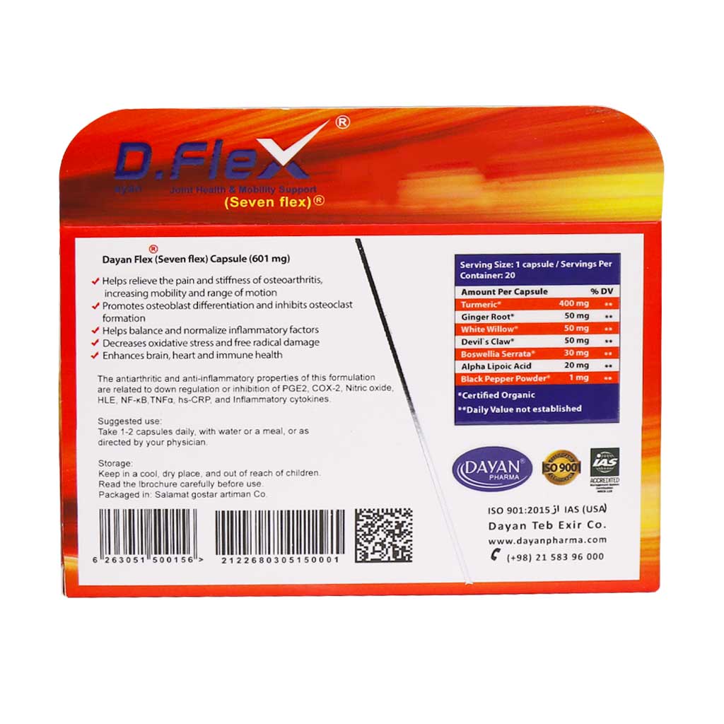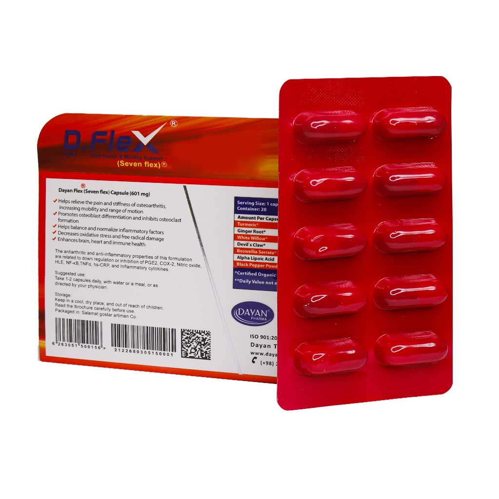 کپسول دایان فلکس دایان فارما با منشا 100 درصد طبیعی حاوی ریزوم زردچوبه، ریزوم زنجبیل، بید سفید، فلفل سیاه، پنجه شیطان، کندر و آلفا لیپونیک اسید بوده که به کاهش درد و التهاب، خشکی مفاصل و مهار تخریب بافت استخوانی کمک میکند. همچنین این محصول با ترکیبات منحصر به فردش یک آنتی اکسیدان قوی بوده که به تقویت سیستم ایمنی کمک میکند. دی فلکس به تسکین انواع دردهای آرتروز و مفاصل کمک میکند و تحرک، استحکام و روان بودن مفاصل را بهتر میکند و بنابراین باعث کاهش سفتی مفصل آرنج، زانو، لگن و شانه میشود. می توان گفت با این ویژگی ها قرص دی فلکس دایان فارما یکی از بهترین قرص ضد درد مفاصل است.