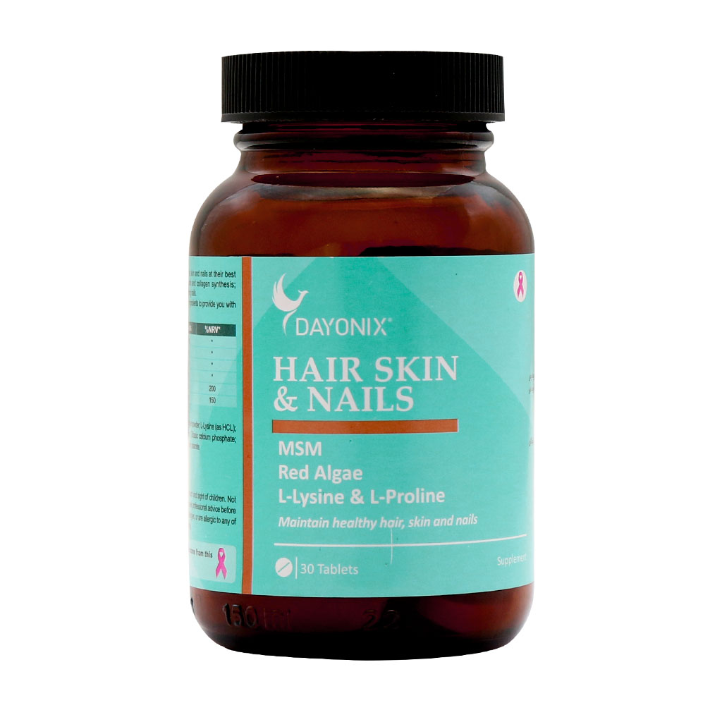 قرص هیر اسکین نیلز دایونیکس فارما تحت لیسانس انگلستان یک مکمل غذایی حاوی متیل سولفونیل متان، ال لیزین، ال پرولین، مس، زینک و جلبک قرمز بوده که به سلامت پوست، مو و ناخن کمک موثری میکند. این دارو کمک میکند تا فولیکولهای مو محافظت شده و از ریزش آنها جلوگیری میکند و در نهایت به پر پشت شدن موها کمک میکند. وجود روی یا زینک در مکمل پوست مو و ناخن به جلوگیری از آسیب اکسیداتیو کمک میکند.
