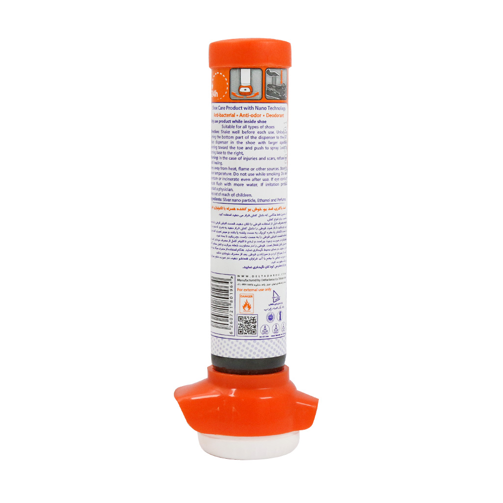 اسپری خوشبو کننده کفش دلتا علاوه بر داشتن بوی مطبوع حاوی ترکیبات ضد تعریق است که از عرق کردن پا درون کفش جلوگیری مینماید. این محصول آنتی باکتریال بوده و اسانس مطبوعی دارد.
